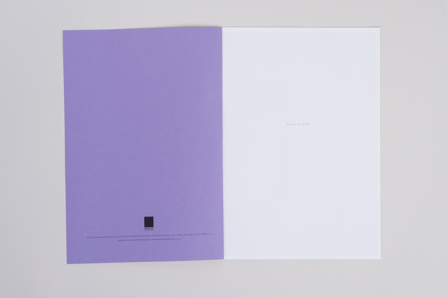 Sending lay outs back and forth, I find myself losing focus, having to delete everything and to start over. Björn feels the same. We’re heading in different directions. The work follows us both and eventually the publication splits into two parts. Two perspectives. Two ways of relating to 87 pictures taken by Björn Bengtsson and Rikard Laving. Whoever they are.
